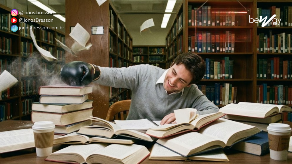 A expressão hit the books significa estudar muito, especialmente quando alguém precisa dedicar tempo e foco aos estudos. Traduzida ao pé da letra, seria “bater nos livros”, mas em inglês essa construção funciona como uma metáfora para mergulhar de vez no conteúdo e começar uma sessão intensa de estudo.